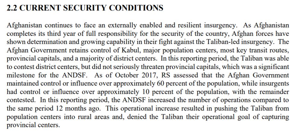 Much of my early blogging was centered on Afghanistan, and this false narrative from the military that we were “making progress” despite being in a situation that was clearly unwinnable (and that any check of a history book would have confirmed as an impossible task) was a frequent target. The persistence with which Sopko’s team documented and evaluated material coming from the military was impressive, especially as the military continually developed “new” tools for assessing progress on security and on training of Afghan troops, primarily so that they could make comparisons to previous data irrelevant. Eventually, the military essentially gave up on this approach and decided simply to classify the bulk of this sort of data so that their lack of progress would not be noted every six months as SIGAR came out with their Congressionally-mandated reports.
