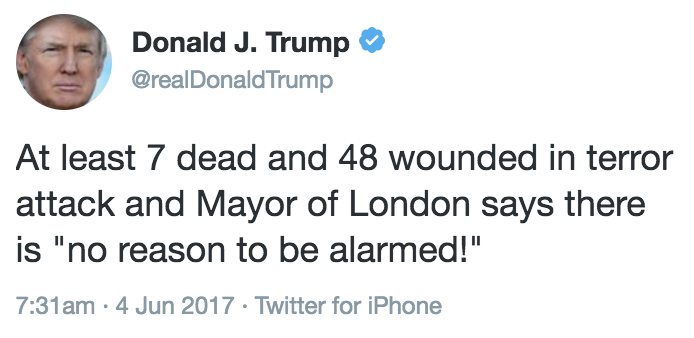He accused London Mayor Sadiq Khan of blowing off the London Bridge terrorist attack.